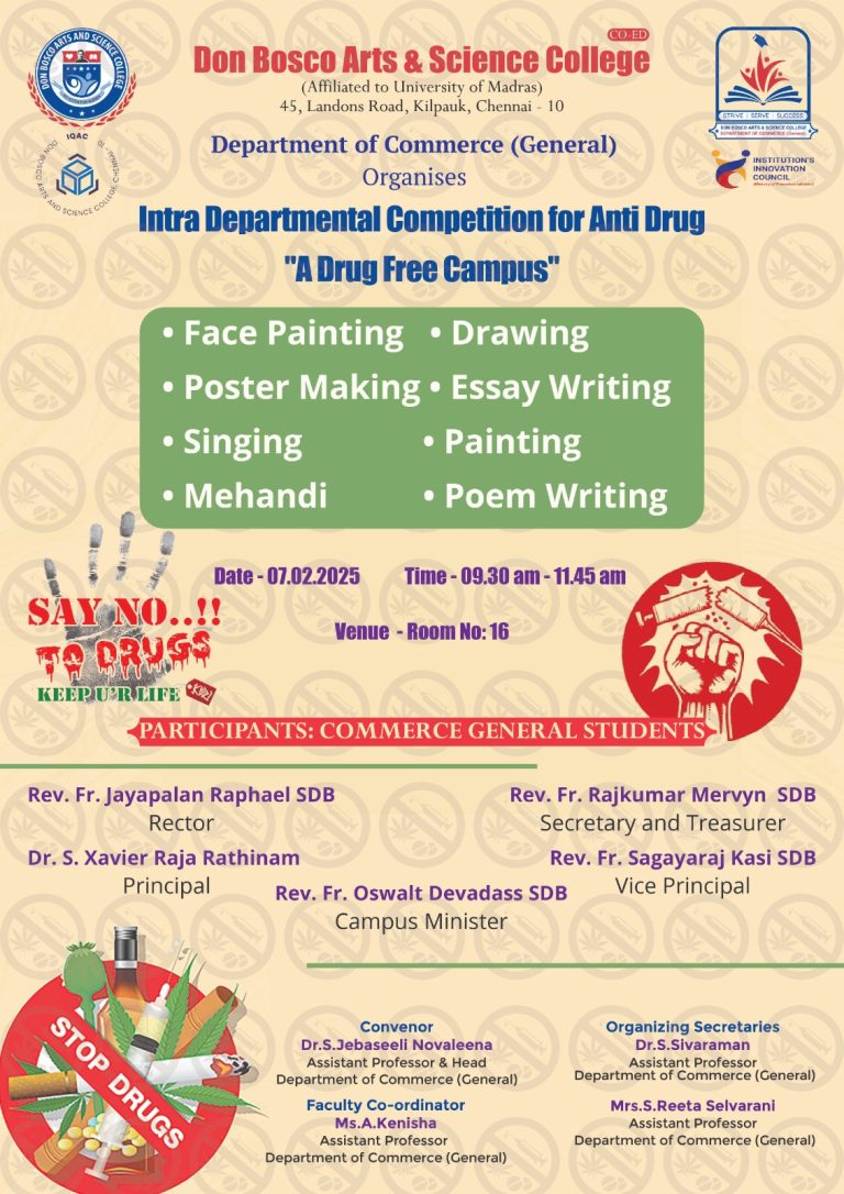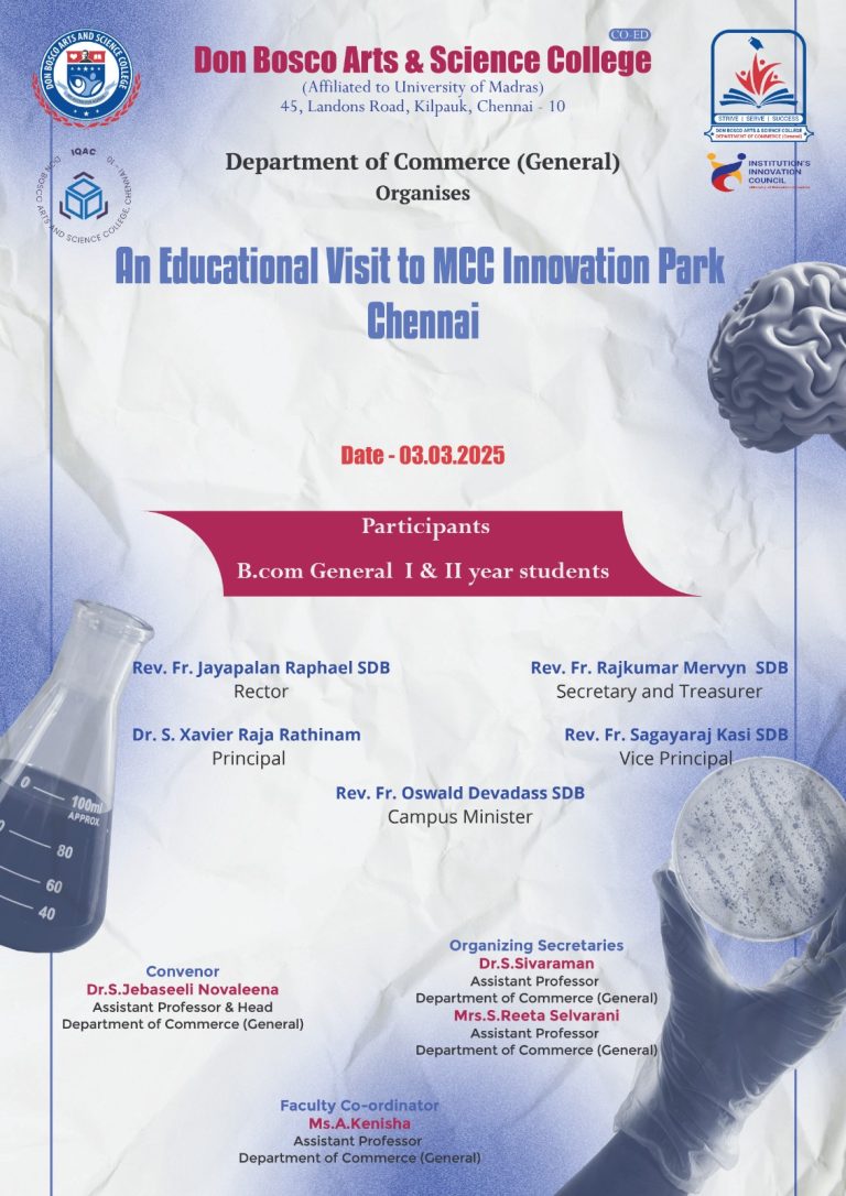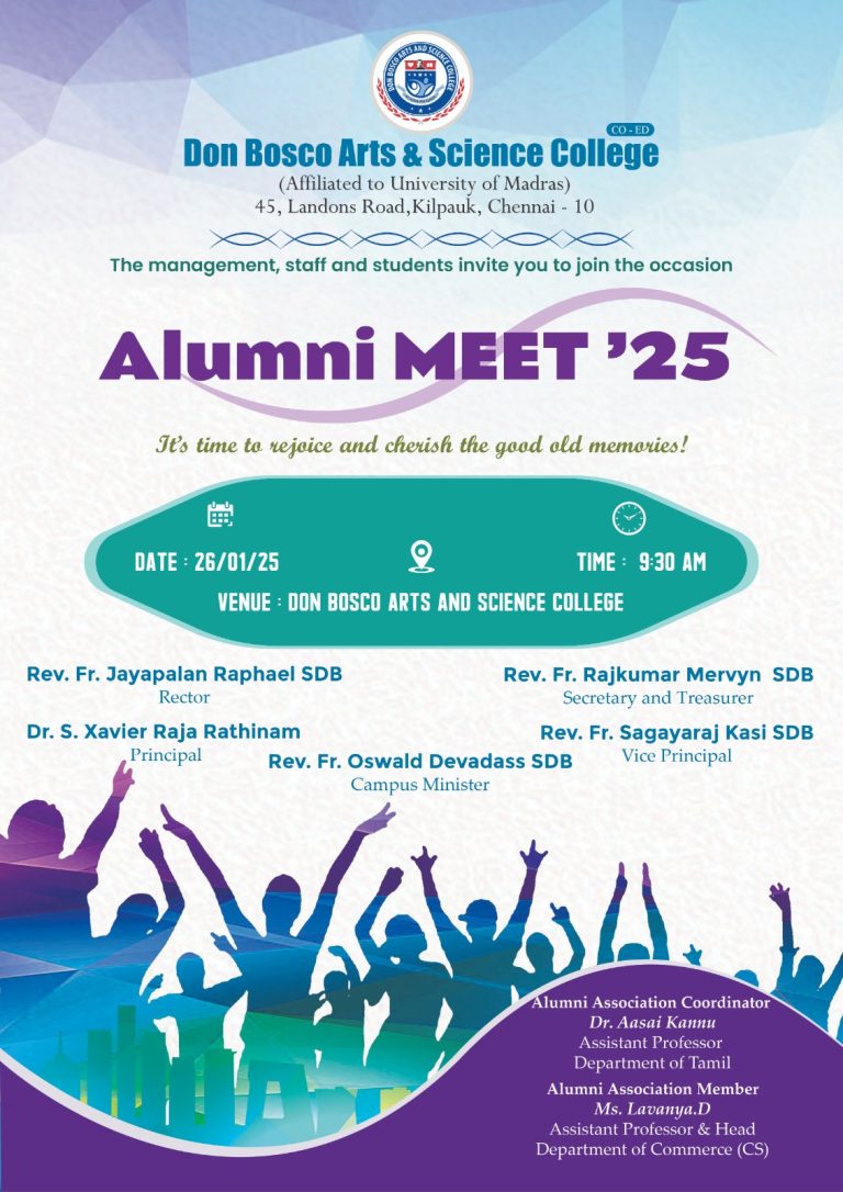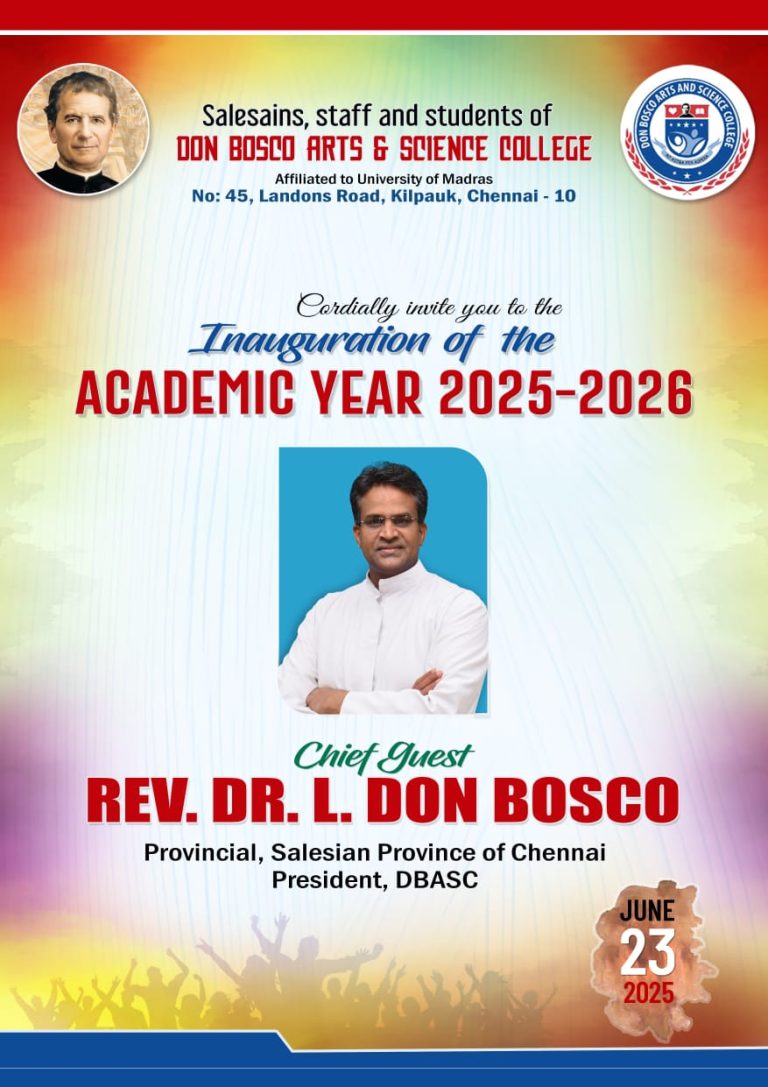 Don Bosco Arts and Science College, Chennai came into existence in 2016 under the auspices of Salesians of Don Bosco. It began functioning with 54 students on the roll in three UG courses: B.Com. Gen, B.Com, CS and Visual Communication. It is a place of higher learning in the field of communication, art and design, commerce and management. The primary aim of the college is to develop the creative intellectual potential of the students and to form them to become intelligent contributors and critical consumers of communication, design, media, business and commerce.